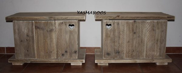 VergelijkEen leuk nachtkastje met deur en hartje van gebruikt steigerhout.